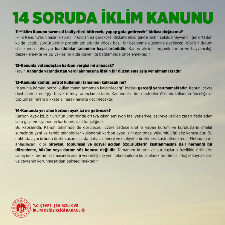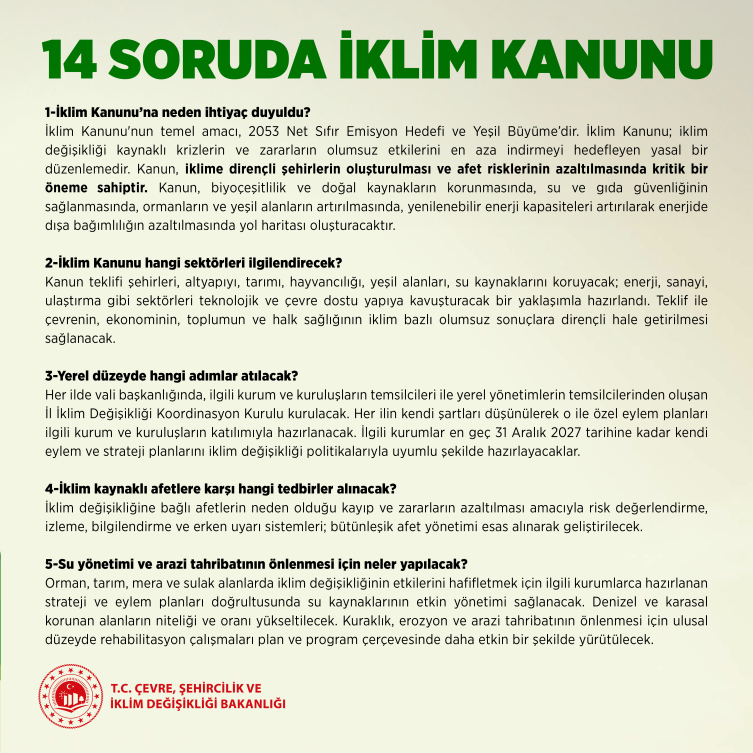 Çevre, Şehircilik ve İklim Değişikliği Bakanlığı, Türkiye'nin ilk İklim Kanunu ile ilgili merak edilen 14 soruyu yanıtladı. 20 madde, 2 geçici madde ve 3 farklı kanunda değişiklik içeren kanun teklifi ile iklim değişikliğiyle mücadele yasal zemine kavuşturulacak. Türkiye'nin ilk iklim kanunu neler getiriyor? İşte cevabı...