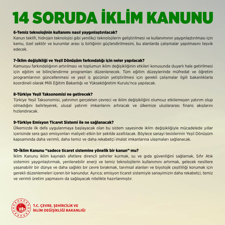 İklim Kanunu; iklim kaynaklı afetlere dirençli şehirler kurmak, su ve gıda güvenliğini sağlamak, Sıfır Atık sistemini yaygınlaştırmak, yenilenebilir enerji ve temiz teknolojilerin kullanımını artırmak, gelecek nesillere yaşanabilir bir dünya ve daha sağlıklı bir çevre bırakmak, tarımsal alanları ve biyolojik çeşitliliği korumak için gerekli düzenlemeleri içeren bir kanun.Ayrıca; emisyon ticaret sistemiyle sanayimizin daha rekabetçi, temiz ve verimli üretim yapmasını da sağlayacak nitelikte hazırlandı.