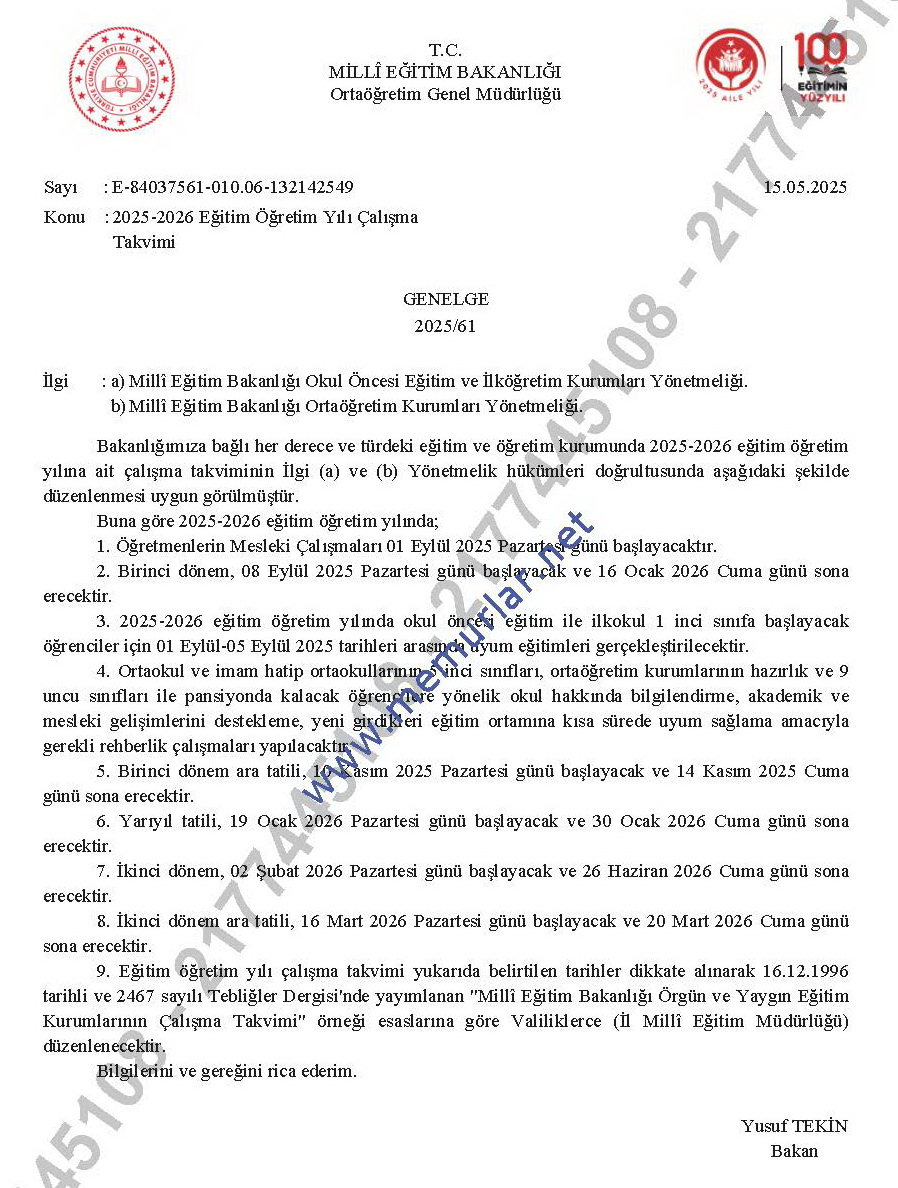 Milli Eğitim Bakanlığı Ortaöğretim Genel Müdürlüğü 15.05.2025 tarih, 132142549 sayılı ve 2025/61 nolu genelgesiyle 2025-2026 Eğitim ve Öğretim Yılı Çalışma Takvimini ve Çalışma Takvimi Çizelgesini açıkladı.