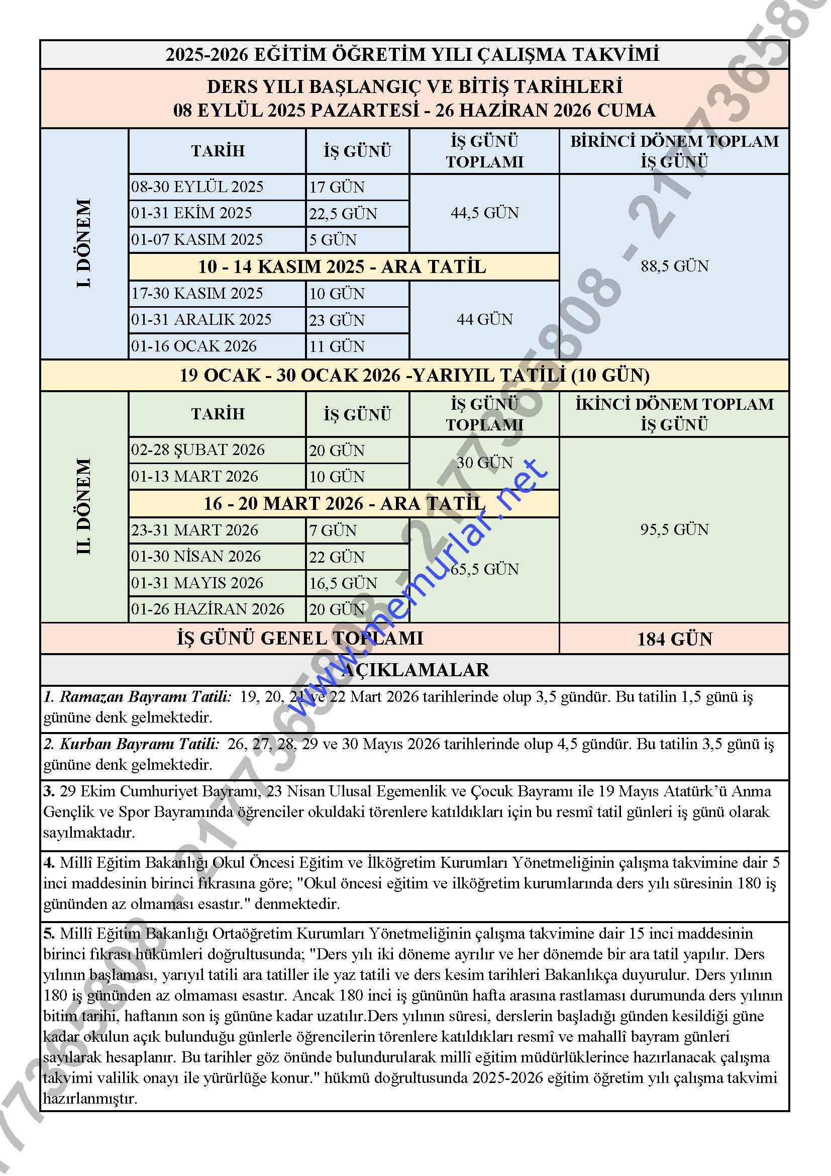 Milli Eğitim Bakanlığına bağlı her derece ve türdeki eğitim ve öğretim kurumunda 2025-2026 eğitim öğretim yılına ait çalışma takviminin Milli Eğitim Bakanlığı Okul Öncesi Eğitim ve İlköğretim Kurumları Yönetmeliği ve Milli Eğitim Bakanlığı Ortaöğretim Kurumları Yönetmeliği hükümleri doğrultusunda aşağıdaki şekilde düzenlenmesi uygun görülmüştür.