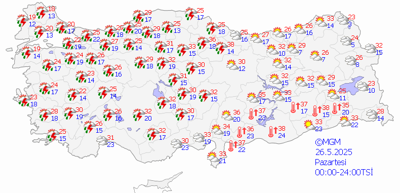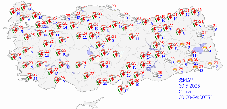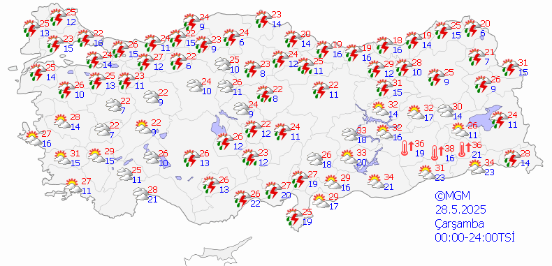 Meteoroloji Genel Müdürlüğü tarafından yapılan tahminlere göre, ülkemiz genelinin parçalı ve çok bulutlu olacağı, Marmara, Ege, Batı ve Orta Akdeniz'in iç kesimleri, İç Anadolu (Sivas hariç), Batı Karadeniz, Orta Karadeniz'in iç kesimleri ile Samsun çevrelerinde aralıklı sağanak ve gök gürültülü sağanak yağışların etkili olacağı öngörülmektedir. Yağışların, Marmara'nın doğusu, Batı Karadeniz (Sinop hariç) ile İzmir, Manisa, Kütahya, Eskişehir ve Çankırı çevrelerinde yer yer kuvvetli olması beklenmektedir. Ayrıca, Marmara'nın doğusu, Ege, Akdeniz, İç Anadolu, Batı ve Orta Karadeniz, Doğu Anadolu'nun batısı ile Güneydoğu Anadolu'da toz taşınımı beklenmektedir.