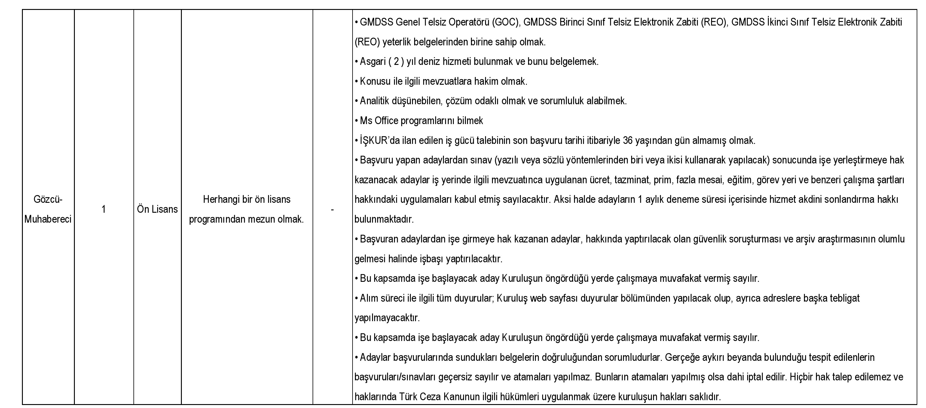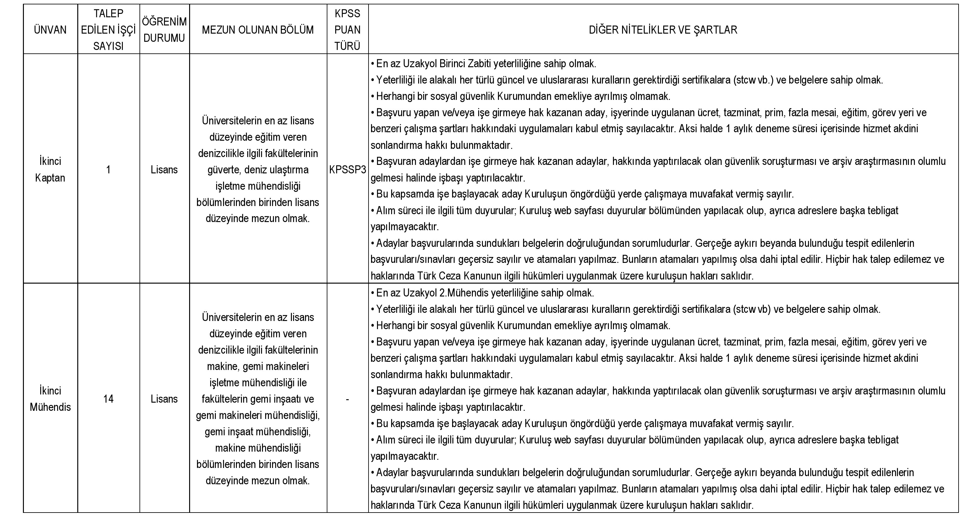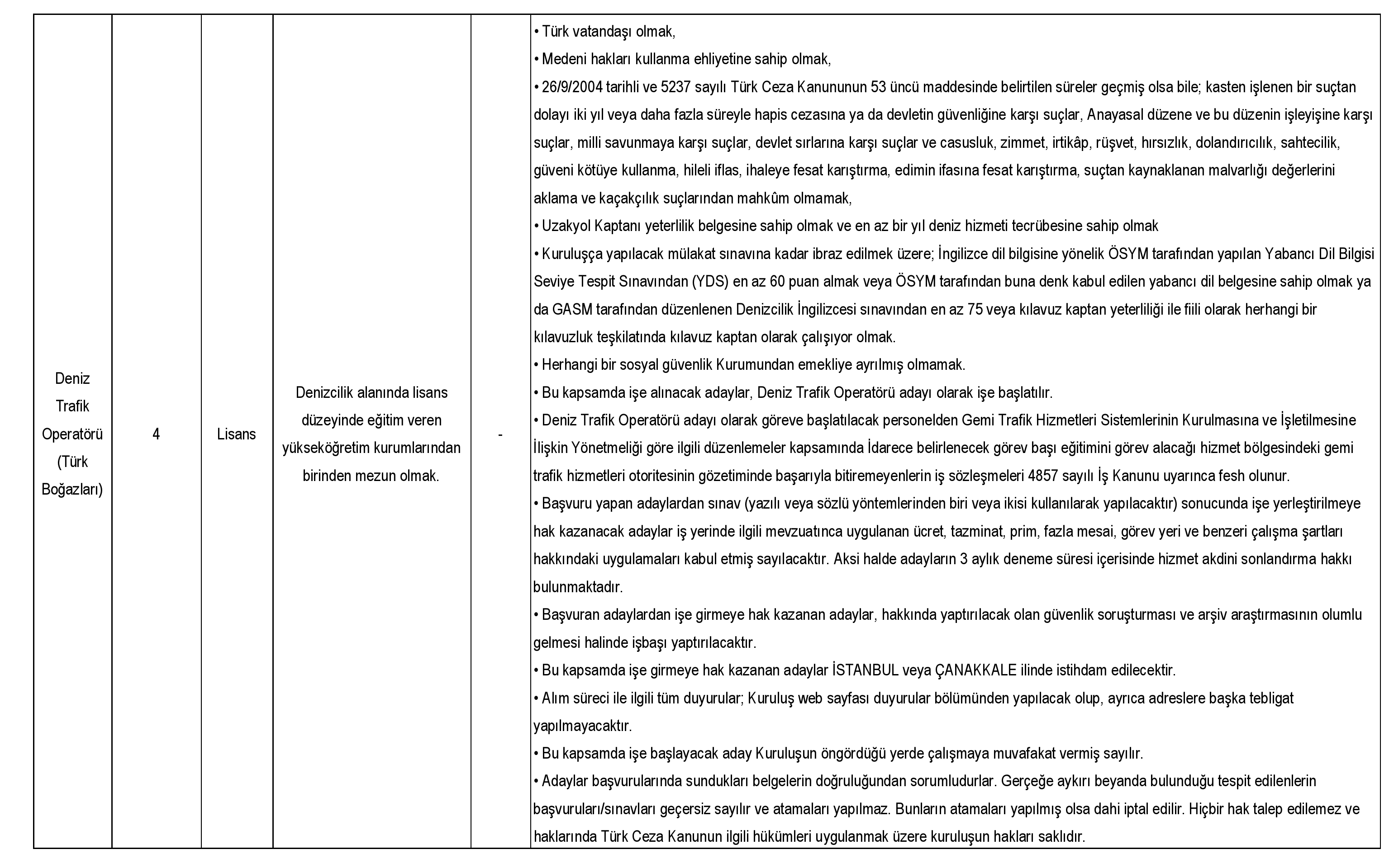 Açıklama 6- 17.03.2025 tarihli ve 32844 sayılı Resmi Gazete'de ilan edilen 5 kişilik Deniz Trafik Operatörü (Türk Boğazları) alımımız ile ilgili işlemler, Kamu Kurum ve Kuruluşlarına İşçi Alınmasında Uygulanacak Usul ve Esaslar Hakkında Yönetmelik hükümleri gereği yerine getirilmiş ve 1 aday işe girmeye hak kazanmıştır. Söz konusu ilanımıza Kamu Personeli Seçme Sınavı (KPSS) kapsamında yeterli sayıda başvuru yapılmadığından, yukarıda belirtilen Yönetmelik'in Taleplerin Kurum tarafından karşılanma esasları başlıklı 10 uncu maddesinin 7 nci fıkrası kapsamında, Kamu Personeli Seçme Sınavı (KPSS) şartı aranmaksızın ilan yayımlanmıştır.