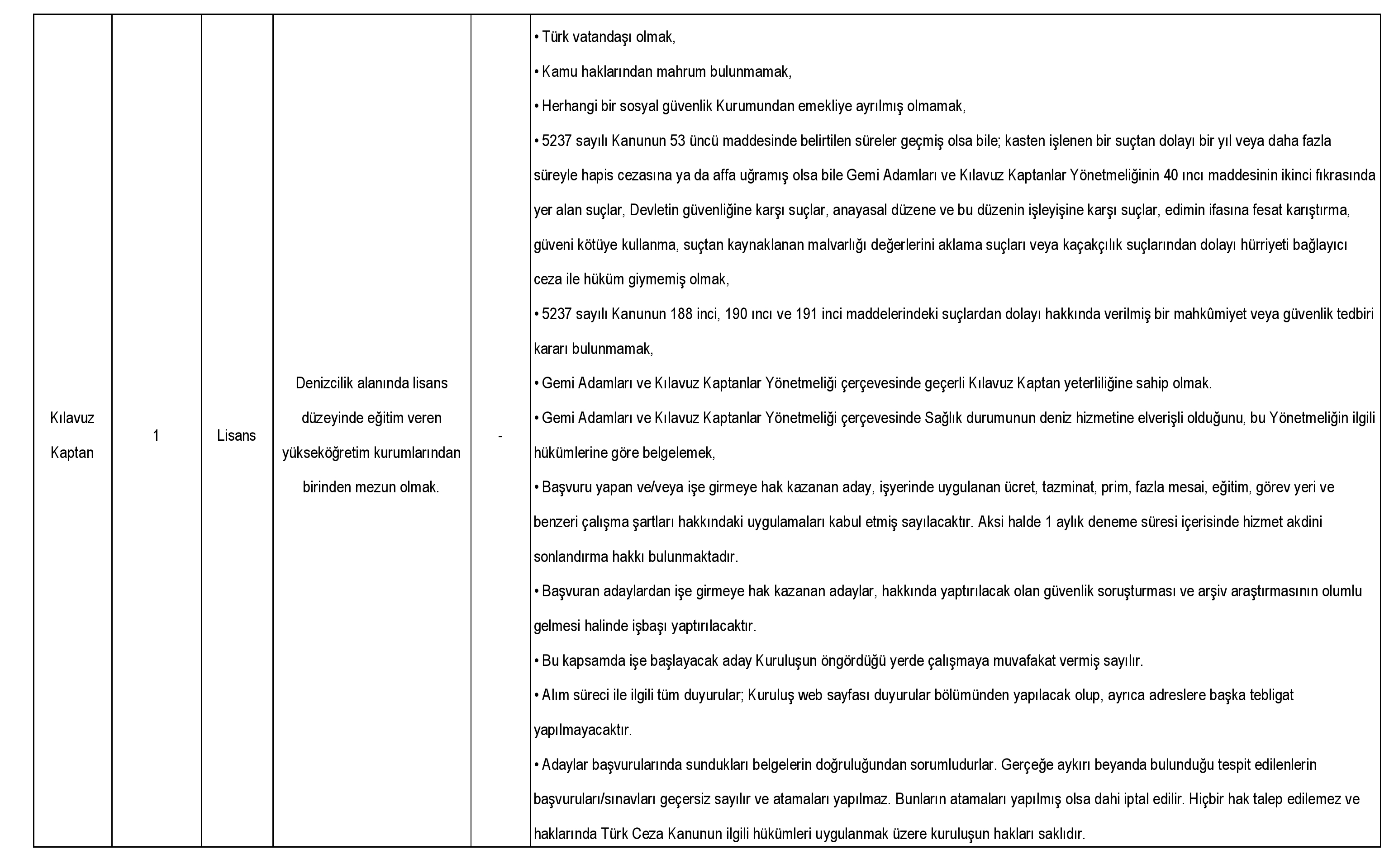 Açıklama 4- 17.02.2025 tarihli ve 32816 sayılı Resmi Gazete'de ilan edilen 10 kişilik Kılavuz Kaptan alımımız ile ilgili işlemler, Kamu Kurum ve Kuruluşlarına İşçi Alınmasında Uygulanacak Usul ve Esaslar Hakkında Yönetmelik hükümleri gereği yerine getirilmiş ve 9 aday işe girmeye hak kazanmıştır. Söz konusu ilanımıza Kamu Personeli Seçme Sınavı (KPSS) kapsamında yeterli sayıda başvuru yapılmadığından, yukarıda belirtilen Yönetmelik'in Taleplerin Kurum tarafından karşılanma esasları başlıklı 10 uncu maddesinin 7 nci fıkrası kapsamında, Kamu Personeli Seçme Sınavı (KPSS) şartı aranmaksızın ilan yayımlanmıştır.