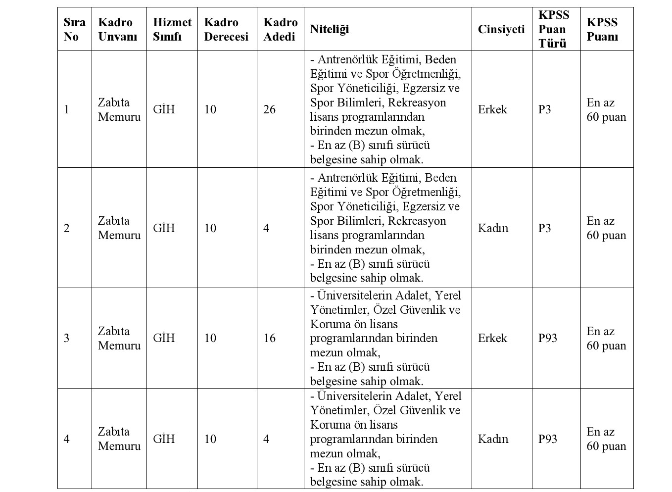 a) İlan edilen zabıta memuru kadroları için mezun olunan okul itibariyle öğrenim şartlarını taşımak ve bu öğrenimle ilgili olarak 2024 yılı Kamu Personeli Seçme Sınavından (KPSS (B) grubu) alım yapılacak kadroların karşısındaki puan türünden, belirtilen asgari KPSS puanını almış olmak,